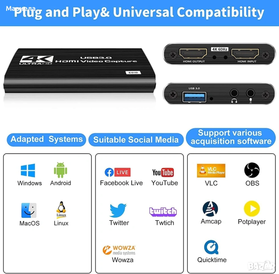 Plug & Play дизайн – Не са необходими драйвери или софтуер; просто свържете и започнете да записвате или стриймвате незабавно.