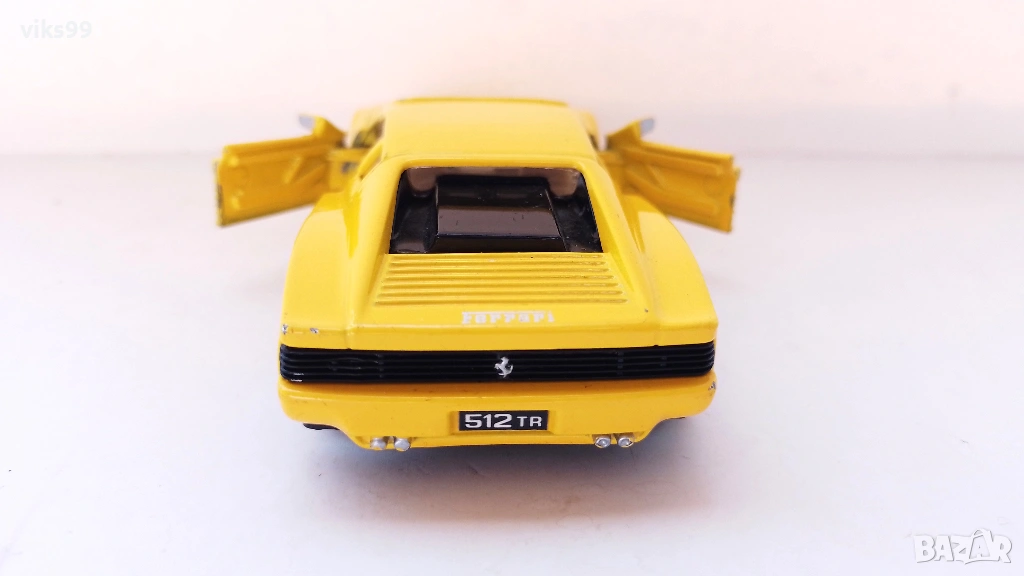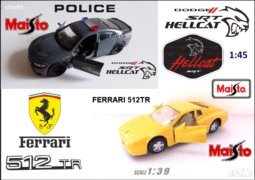 Метални колички с отварящи се врати Maisto - Ferrari 512TR - Мащаб 1:39 и 2018 Dodge Charger SRT Hellcat Police - Мащаб 1:45 (с Pull back механизъм), състоянието им е видно от снимките.