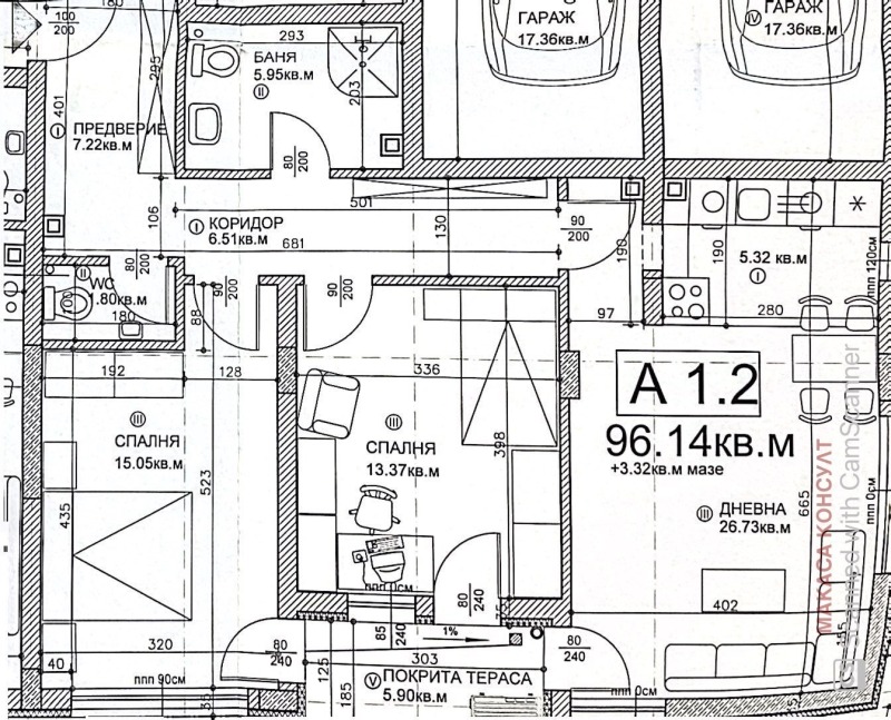 Предлагания имот е Ап. 1.2 с РЗП 113 кв.м, и ЗП 96 кв.м, които се разпращат в следното разпределение: входна антре, просторна дневна с трапезария и кухненски бокс,две спални, баня със санитарен възел, втори самостоятелен санитарен възел, покрита тереса/ двор, намира се на партерен етаж от общо 6 етажна кооперация. Към имота има мазе. Допълнително може да са закупи гараж на нота 0.00м. или подземно паркомясто.