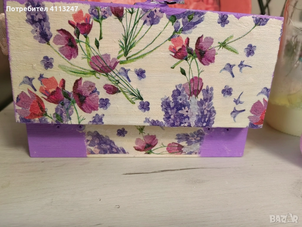 Нежна и романтична кутия, изработена изцяло на ръка с много внимание към детайла. Декорирана в лилави тонове с флорален мотив, богата композиция от изкуствени цветя и фина дантелена панделка. Подходяща за подарък, бижута, спомени или като акцент в интериора.