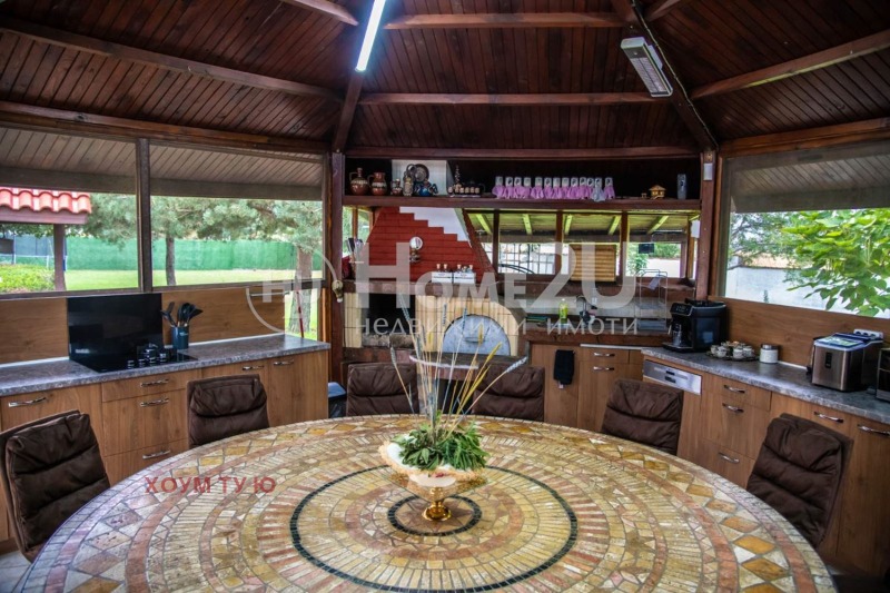 Представяме на Вашето внимание Луксозно имение находящо се на 30 минути от центъра на град София ! Поземления имот е с площ от 5 407 кв.м., като в него има разположени следните обекти: Басейн с бар за лятото, джакузи, барбекю зона, лятна кухня, японска градина, навес за паркиране на три автомобила, паркинг за още пет автомобила, портиерска постройка, детска зона за забавления, двоен гараж и къща с площ от 580 кв.м., със следното функционално разпределение: Сутерен стая предназначена за фитнес, склад, баня с тоалетна, сауна, механа с бар и сервизно помещение, от сутерена има изход към задната част на двора. Първи етаж просторна дневна с излаз на двор, кухня, баня с тоалетна, спалня с баня с тоалетна, сервизно помещение и стая обособена за детски център. Втори етаж четири спални, всяка от които е със собствена баня с тоалетна и излаз на тераси, едната от които е с площ от 35 кв.м., портиерна стая, склад и баня с тоалетна. Къщата е завършена 2000 година. Има инсталирана система за управление на къщата от телефона. Отоплението е решено посредством климатици, бойлер, генератор, термопомпа, система посредством гориво, като има и опция и за газ, която е прекарана до парцела. Разполага също така и с резервен генератор. Има направена поливна система в двора. Към канализацията е свързана посредством септична яма с помпа. В близост до имота се намира новопостроеният Ритейл Парк Костинброд, Конна база, квартал Люлин ( 5 минути с автомобил ), центъра на град Костинброд (5 минути с автомобил), новопостроената магистрала посока Сърбия (2 минути), спирка на транспорт (1 минута пешеходно разстояние). Ако търсите спокойствието на крачка от града, или пък сте готови за нова инвестиция, обадете се сега и цитирайте следния код:143347