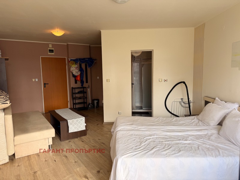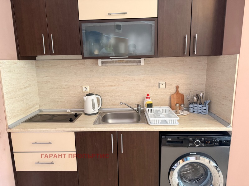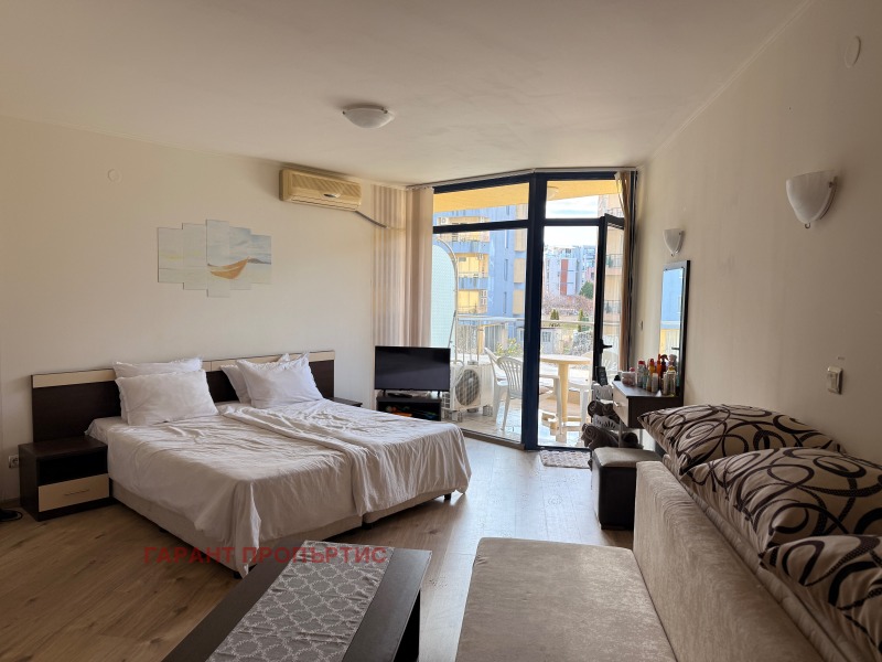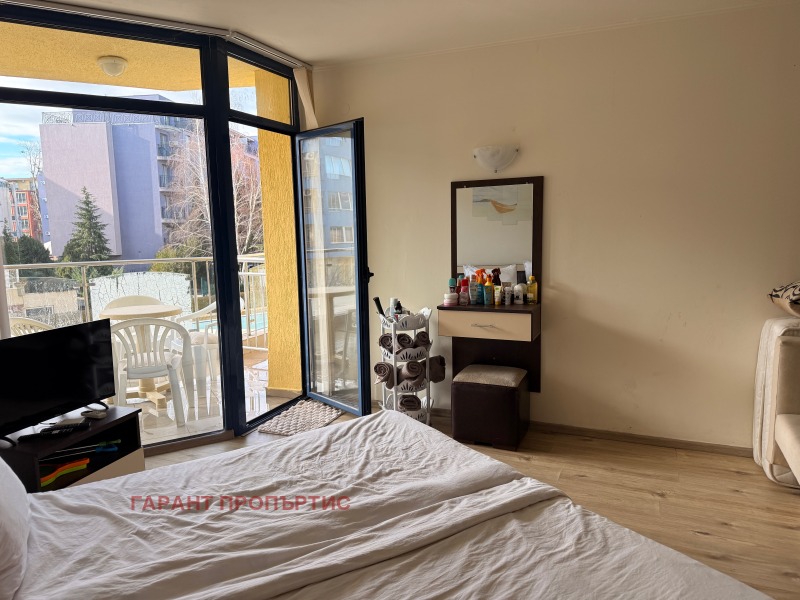 Вътрешното разпределение на студиото е функционално и предлага достатъчно място както за обособяване на зона за спане, така и за дневна с кухненски бокс. Светлите тонове и прозорците с гледка към басейна придават приятно усещане за простор и спокойствие. Имотът се предлага напълно обзаведен и готов за ползване, което го прави подходящ за незабавно обитаване или отдаване под наем - дългосрочно или сезонно.