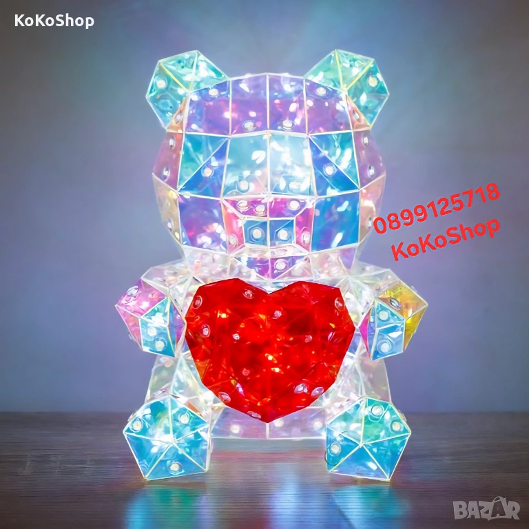 Мечето е с 3D дизайн и многоцветни LED светлини, които придават модерен и „уау“ ефект. Готово е за подаряване – без нужда от допълнителна опаковка, което го прави отличен избор за хора, които търсят нещо различно и запомнящо се.