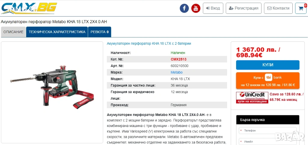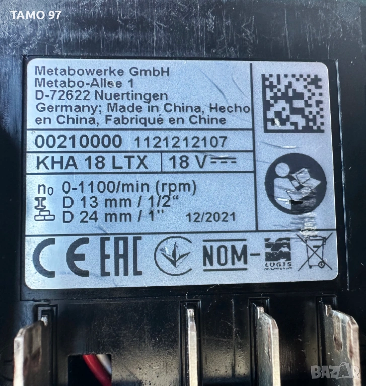 Метабо в отлично визуално състояние, както се вижда на снимките и работи брилянтно без никакви странични шумове или проблеми, внос от Франция. Обявената цена включва перфоратора с две батерии по 18V 5.5Ah с индикатор и зарядно устройство има и вариант само боди без батерии и зарядно за 135евро. Пращаме с преглед и тест с куриерска фирма еконт може и лично предаване за гр. Шумен.