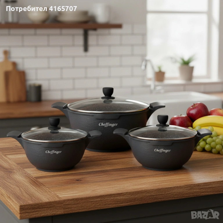 Комплект от 3 тенджери Cheffinger с мраморно покритие 20/24/28 см с капаци – незалепващи съдове за в → Обява 53190952