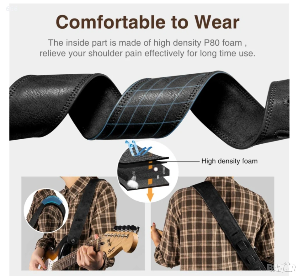 Подплатата е от мека кожа, пълна с 10 милиметра спортна пяна с висока плътност, за да се усеща китарата лека като въздух.