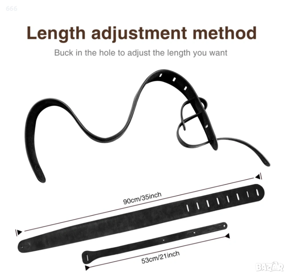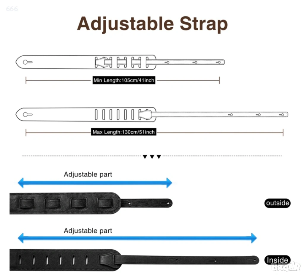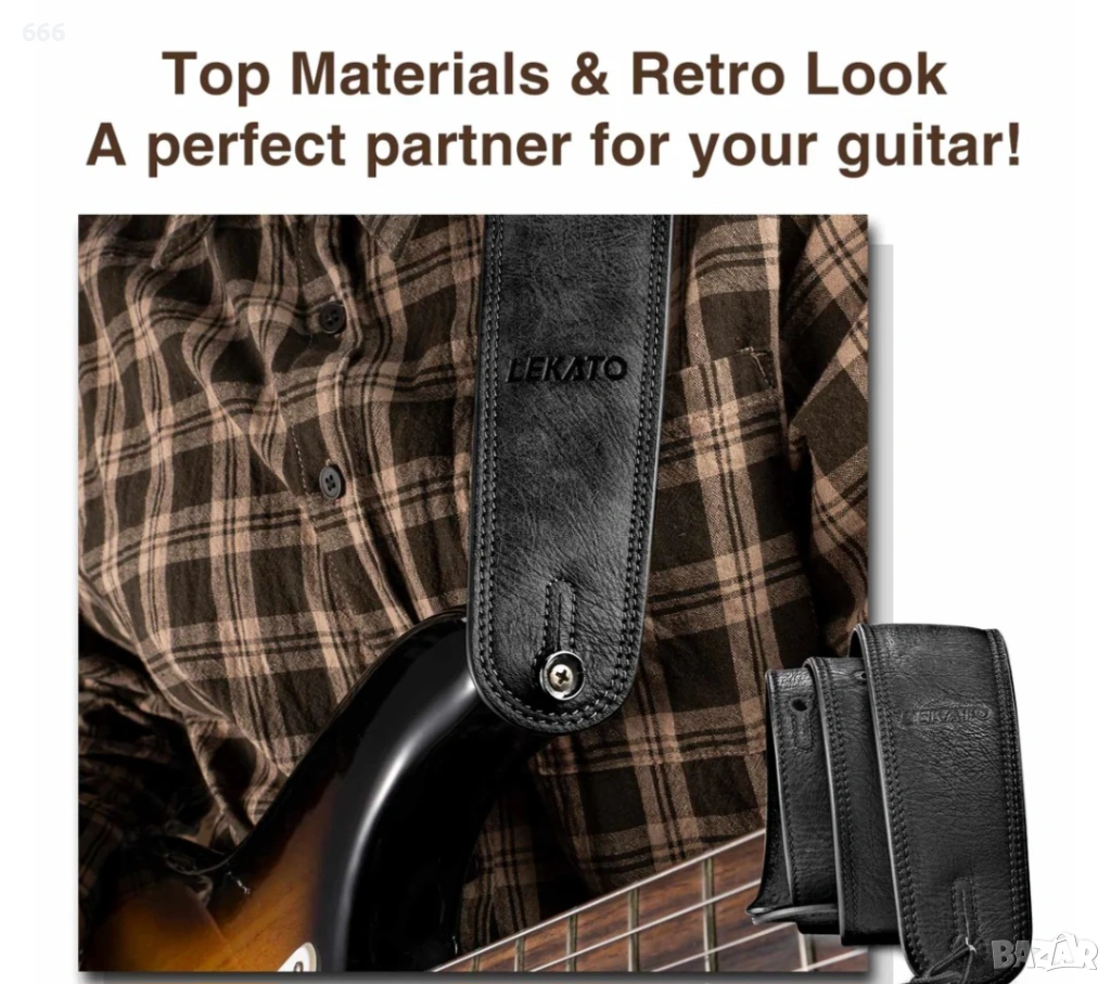 кожена китарна каишка LEKATO с напълно регулируем диапазон от 41" до 51", което я прави идеална за хора с различна височина и телосложение.