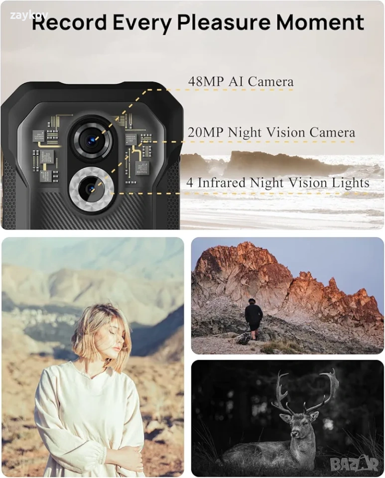 【48MP двойна AI камера + 20MP камера за нощно виждане】 Здравият телефон DOOGEE S61 Pro е оборудван с 48MP + 20MP двойна AI камера, за да покаже вашия висок клас фотографски талант. 20MP камера за нощно виждане с 4 инфрачервени източника на светлина може ясно да възприема нещата около вас дори на тъмно, идеална за тези, които работят през нощта или търсят нощни животни.