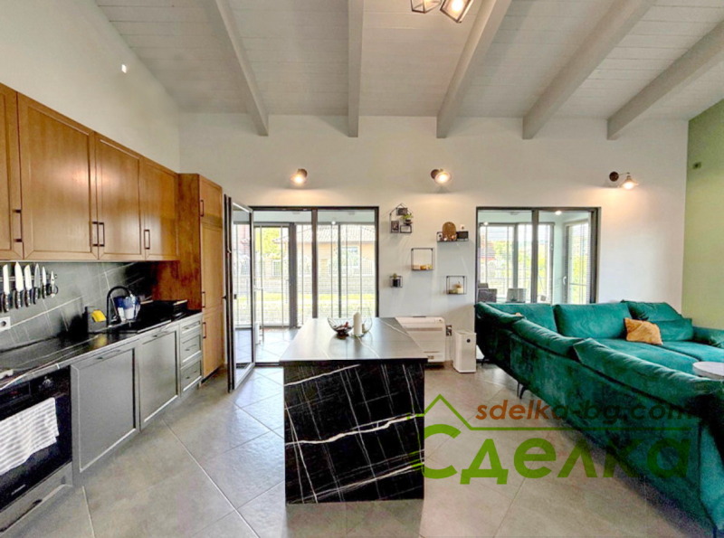 Основният етаж се състои от просторна дневна с кухненска част и излаз към голяма остъклена веранда. Три самостоятелни спални от които едната е със собствена баня с тоалетна.Втора баня със санитарен възел и отделно мокро/перално помещение с тоалетна.