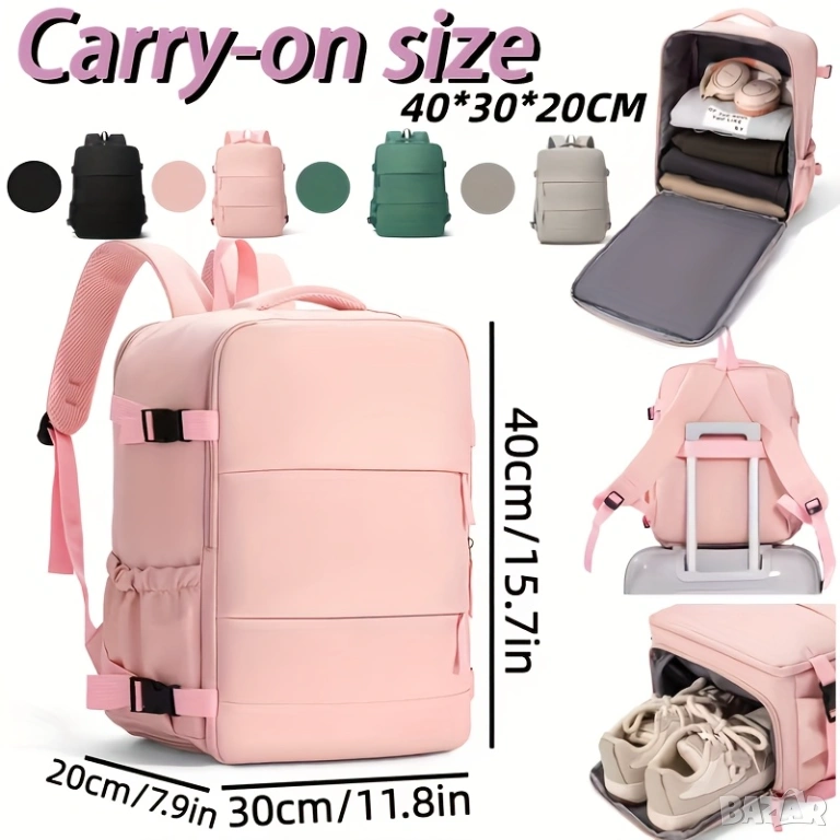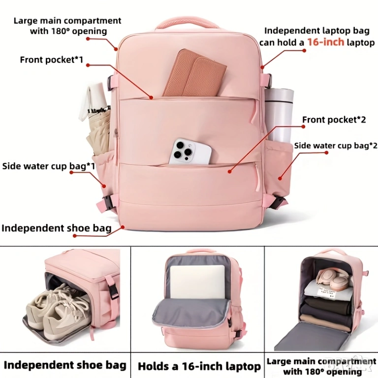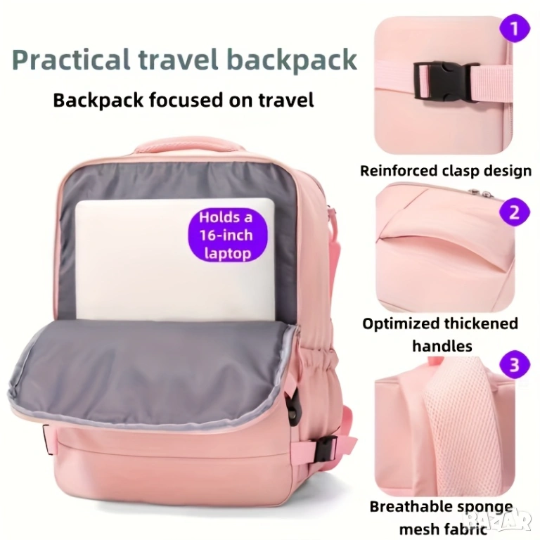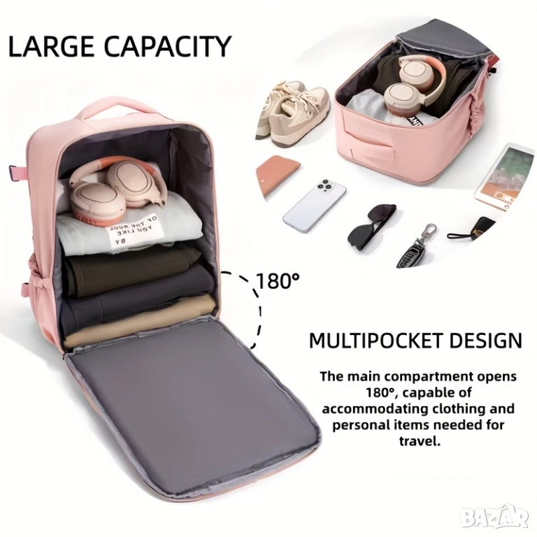 Тази унисекс раница за пътуване е проектирана така, че да отговаря на изискванията за безплатен ръчен багаж на повечето авиокомпании. С практично 180° отваряне тип куфар, тя осигурява бърз достъп и отлична организация на багажа.