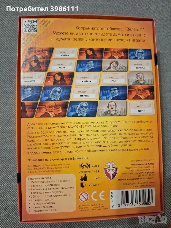 Двама координатори знаят тайната самоличност на 25 субекта. Техните съотборници са запознати единствено с Кодовите имена на тайните агенти. Двата отбора се състезават кой първи ще осъществи контакт със своите тайни агенти. Координаторите дават указания, състоящи се от една дума, която може да водят до една или няколко от картите на игралното поле. Техните съотборници се опитват да разкрият самоличността на своите агенти, като се стараят да избегнат сблъсъка с чужди шпиони. Същевременно, всички се стремят да избегнат убиеца. Кодови имена - печелите или губите, забавлението е в това да разгадаете уликите!