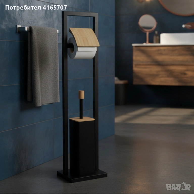 Стойка 2в1 Cheffinger за баня с тоалетна четка и държач за тоалетна хартия – метал и дърво → Обява 53191967