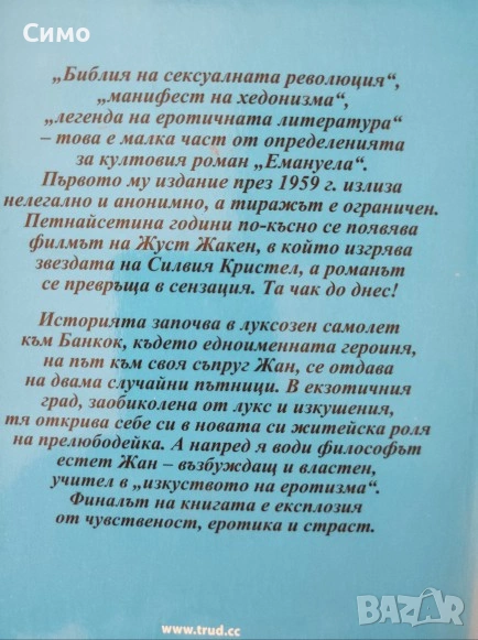 „Библия на сексуалната революция”, „манифест на хедонизма”, „легенда на еротичната литература” – това са малка част от определенията за култовия роман „Емануела”. Първото му издание през 1959 г. излиза нелегално и анонимно, а тиражът е ограничен. Петнайсетина години по-късно се появява филмът на Жуст Жакен, в който изгрява звездата на Силвия Кристел, а романът се превръща в сензация. Та чак до днес!