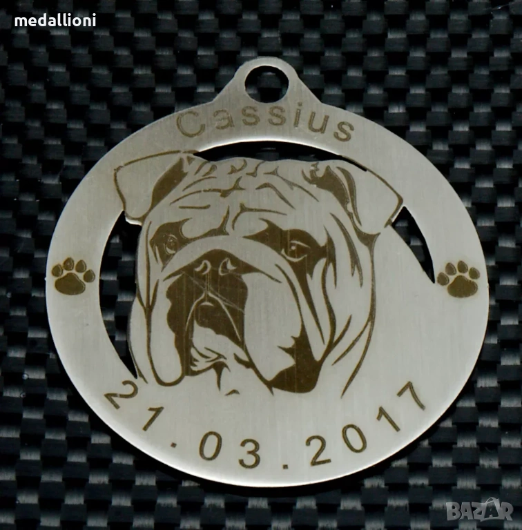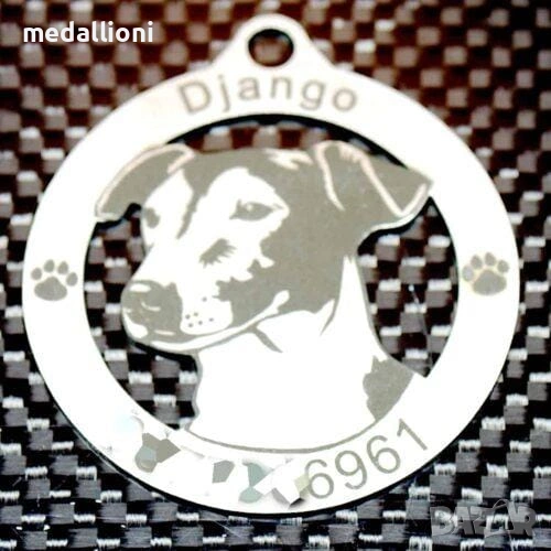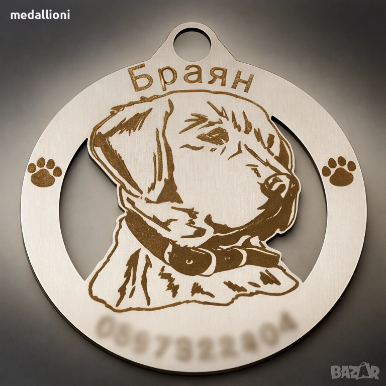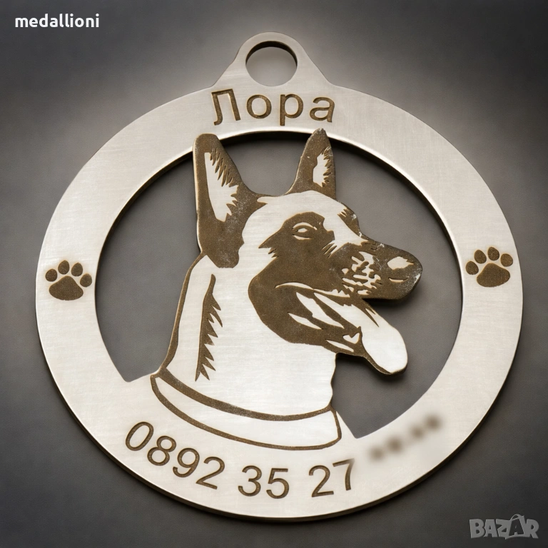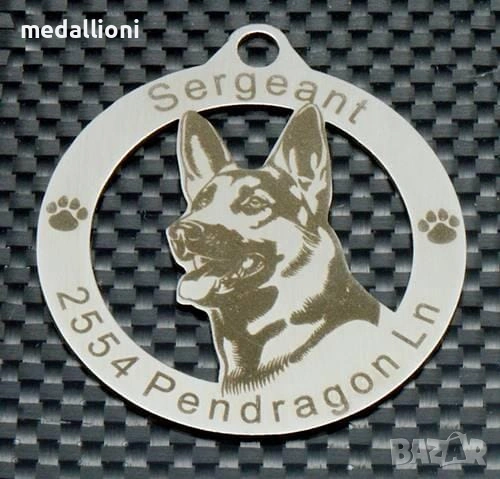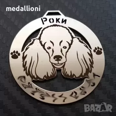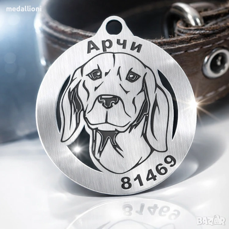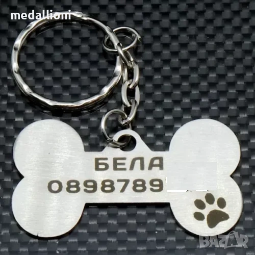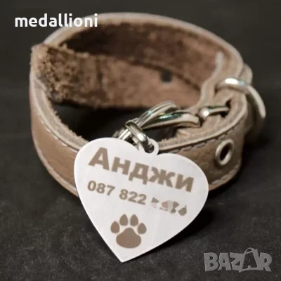 Продавам персонализирани медальони за кучета с гравиране на име и телефон, подходящи за почти всички породи – от дребни до едри кучета.