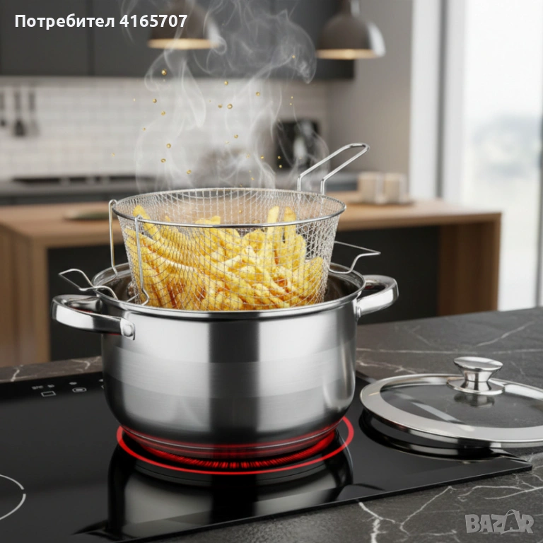 Комплект: тенджера, стъклен капак, кошница за пържене;