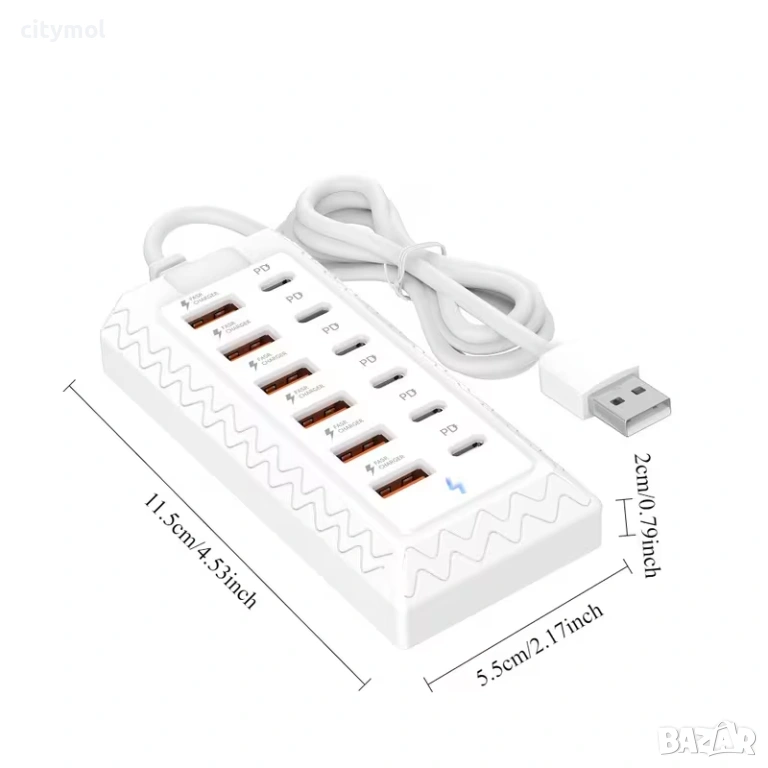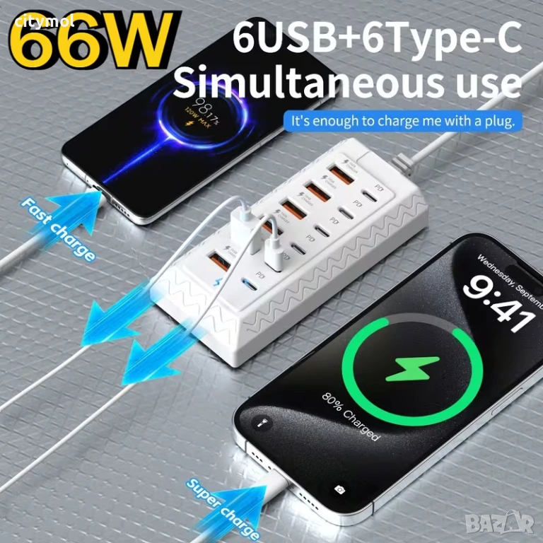 12-портово зарядно устройство за бързо зареждане, 66W, 6 USB + 6 Type C порта, 100 см кабел