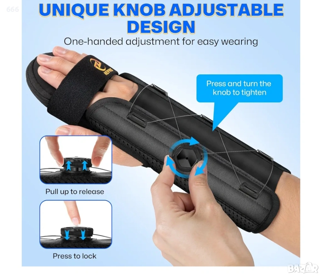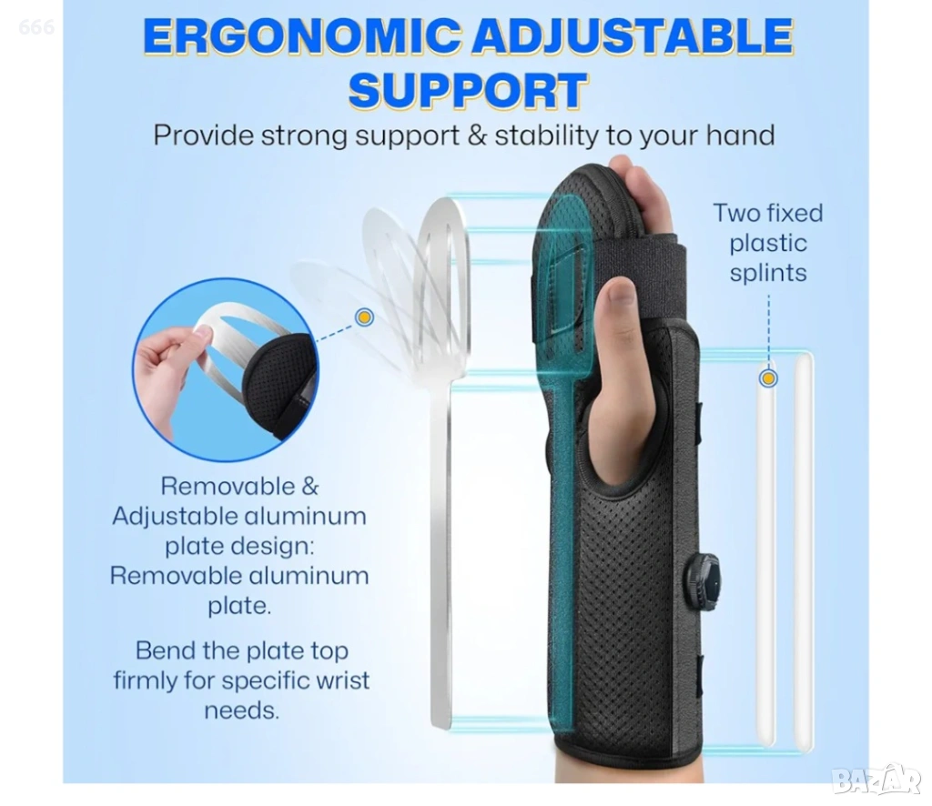 Подвижна алуминиева плоча – Ортезата за китка е с лека, подвижна алуминиева плоча за опора. Огънете здраво горната част на плочата за специфични нужди на китката. Осигурява гъвкавост при ежедневни дейности. Ергономичният дизайн поддържа пръстите и китките отпуснати.