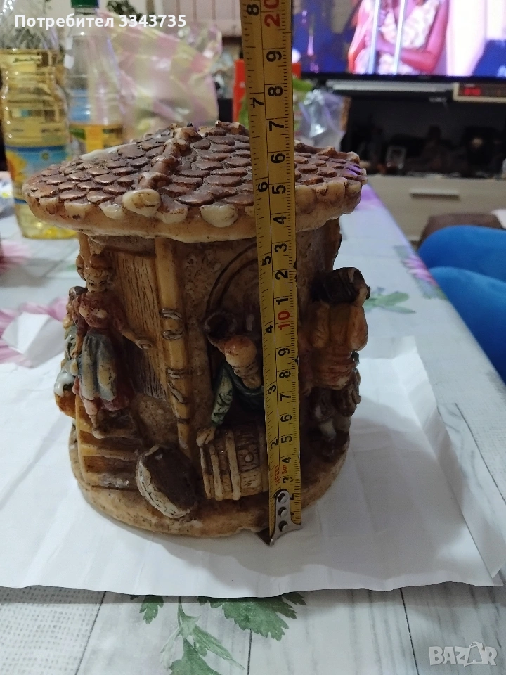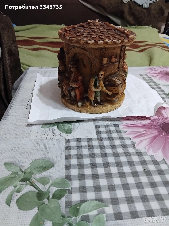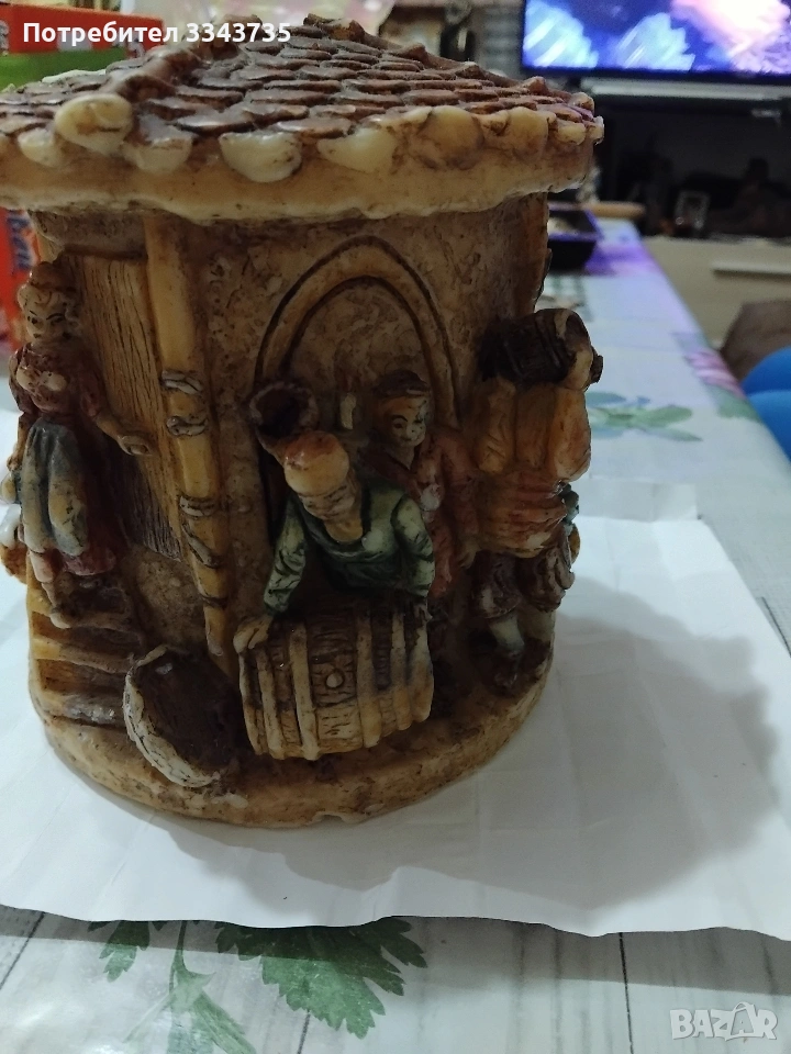 Изобразеният предмет е декоративна склупторна немска вечна свещ ( eternal candle) от Johann Gunter Kerzen (Gunter Candles) от Валдурн, Баден,Германия. Произведена от компанията Johan Gunter Wachswarenfabrik, активна от 1924 год. Основният корпус е от восък , ръчно рисуван (Handbemalt),изобразяващ селска или битова сцена ,с хора и къща,оформена като буре.Тези срещи са популярни със своите детайлни резбовани сцени от ежедневието,и са били защитени с търговска марка (Schutzmarke)и дизайн Geschmacksmuster Geschutzt).Всичко е видно на снимките.Ако изявите интерес пишете или се обадете възможен е лек коментар за цената.