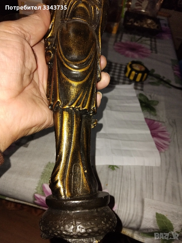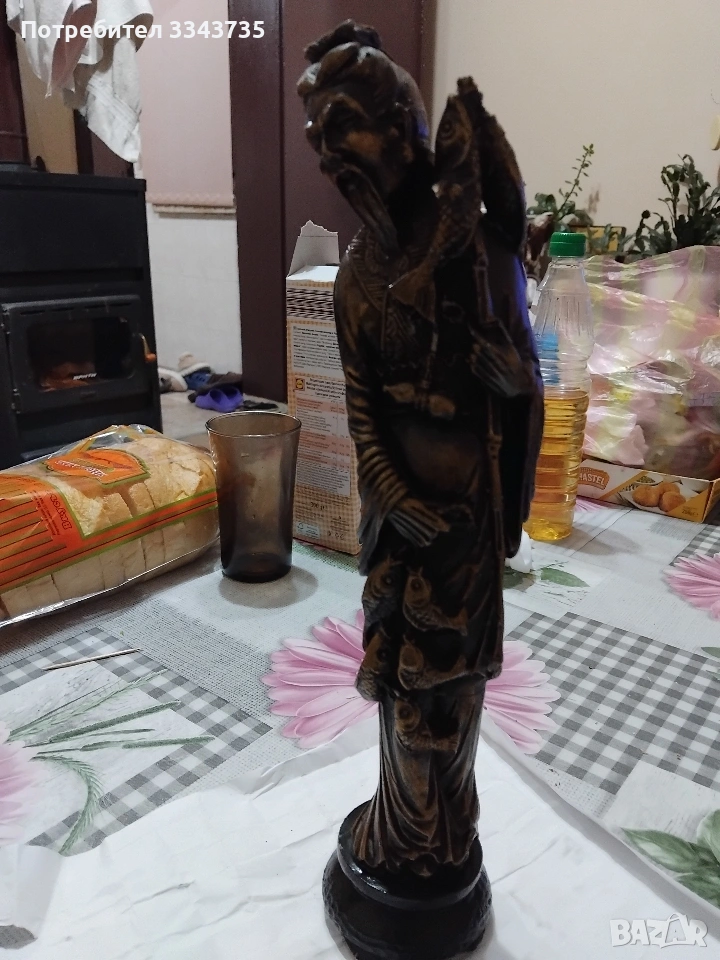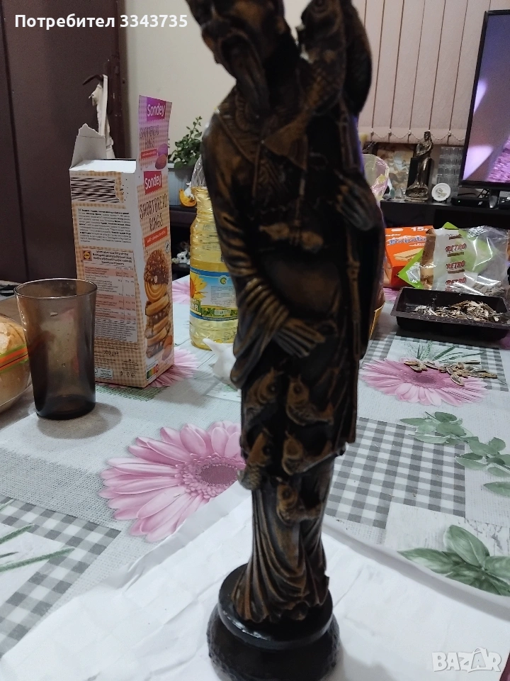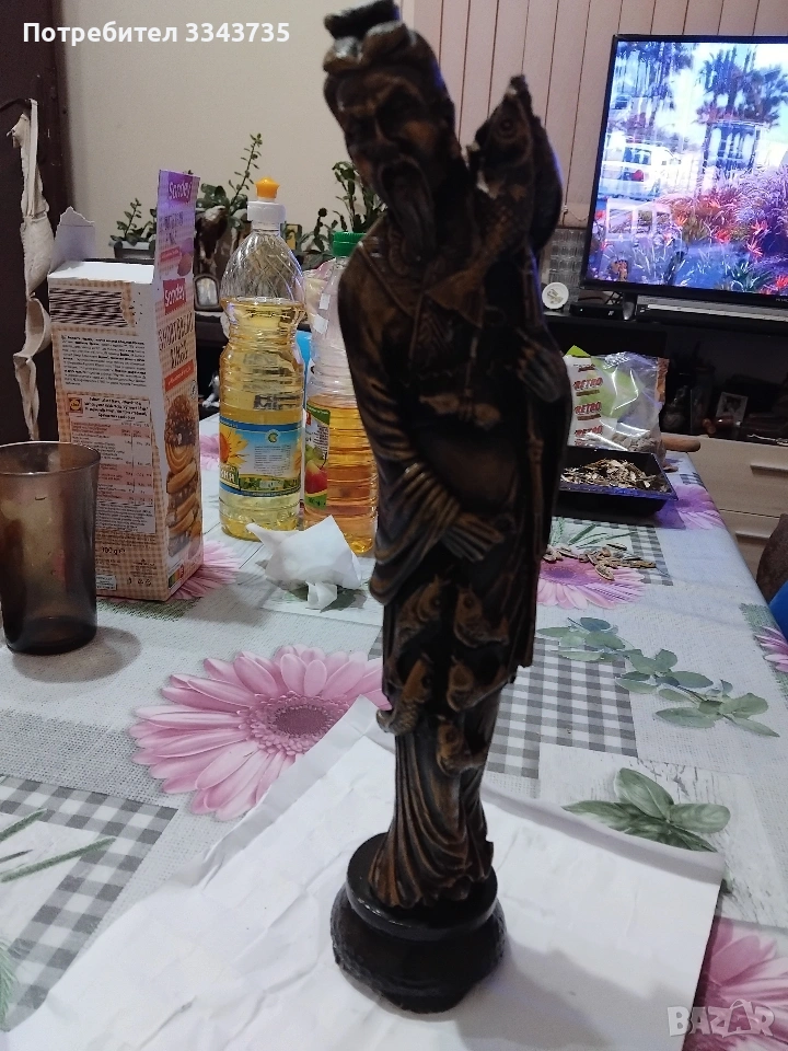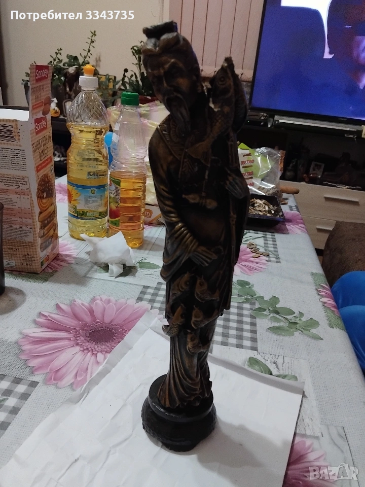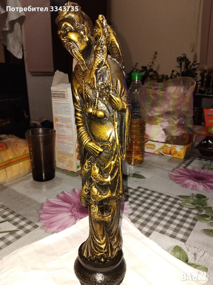 Продавам голяма китайска статуетка,изобразяваща рибар.Подобни фигури са символи на материално благосъстояние дълголетие.Тази златна фигурка изобразява възрастен азиатски мъж,често наричан"китайския рибар"или "ловец на богатство"в контекста на фън шуй.Тя е популярен символ на богатство,изобилие и успех в китайската култура Фигурката на рибаря символизира постоянство,търпение и възнаграждението от усиления труд,както и постигането на целите в живота.Понякога се свързва с конкретни исторически или митични фигури,включително някои от боговете на богатството(Цай Шен),които носят късмет и просперитет.Златният цвят допълнително подчертава темата за богатството и парите.Обикновено тези статуетки се изработват от полярезин и смола,използват се за декорация в дома или офиса,за да привличат положителна енергия и финансов успех.Всичко се вижда на снимките.При интерес на лс.или се обадете може да се уговорим допълнително за цената.