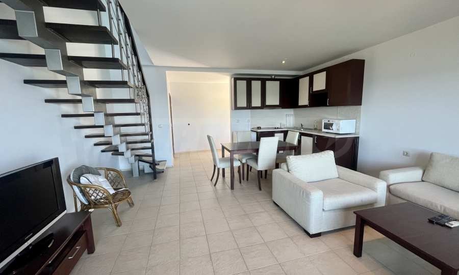 Апартаментът се намира на 1-ви и 2-ри етаж и се състои от всекидневна с кухненски бокс, две спални и две бани. Продава се с наличното обзавеждане и оборудване.