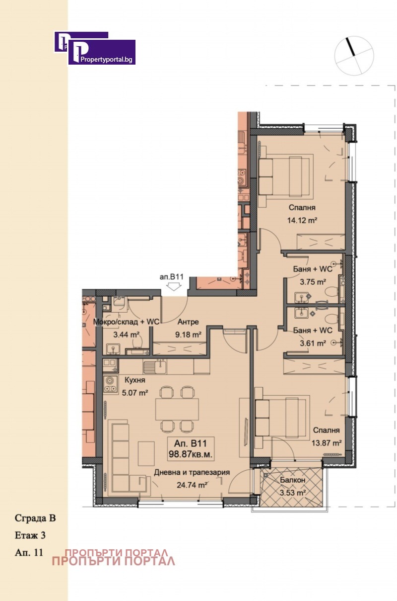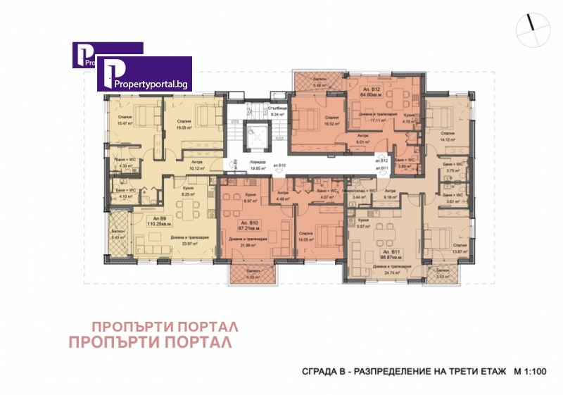 Агенция за недвижими имоти Пропърти Портал предага тристаен ЮЖЕН апартамент на ТРЕТИ жилищен етаж в сграда В.