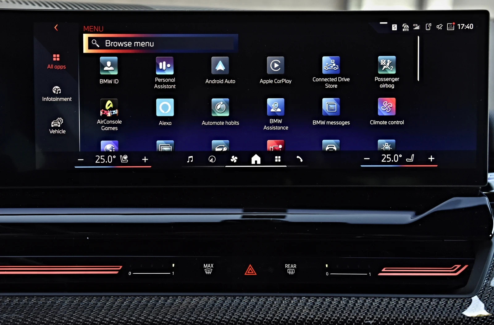 Нов внос от Германия , заводска гаранция до 10. 2027, обслужена на 24500км в оторизиран сервиз във Франкфурт , платени каско и гражданска , Лизинг ! Задвижване и трансмисия 8-степенна автоматична трансмисия Steptronic Задвижване на всички колела (xDrive) Рекуперация на спирачна енергия Избор на режими на шофиране (Drive Mode) Линия на оборудване и пакети Линия на оборудване: M Sport Пакет M Sport с допълнителни специфични елементи Професионален пакет Travel Пакет Comfort Пакет огледала (външни огледала, отопляеми, електрически, автоматично прибиращи се) Пакет външен вид: BMW Individual High Gloss Shadow Line, M Shadow Line Електрически теглич Пакет помощ при шофиране: Driving Assistant Plus Пакет Parking Assistant Plus Пакет Connected Package Professional Пакет Innovations Сертификат BMW Premium Selection Асистиращи системи Head-Up дисплей Асистент за мъртва зона Автоматични фарове Адаптивен темпомат с функция Stop & Go Асистент за смяна на лента Асистент за напускане на лентата (Driving Assistant) Асистент при сблъсък (Active Guard с автоматично спиране) Асистент за разпознаване на пътни знаци Асистент за движение с ремарке (Gespannstabilisierung) Асистент за аварийно спиране Асистент за избягване на препятствие (Ausweichassistent) Асистент за избягване на челен сблъсък отзад Автоматично паркиране (BMW ParkAssistant) Камера за задно виждане Система с камери за 360 изглед (Surround View) Remote 3D View (дистанционно виждане на автомобила) Сигнал при напречен трафик Система против грешна посока Пост-авариен асистент (Post-Crash System / iBrake) Активна защита на пешеходци Светлини и видимост Адаптивни LED фарове Адаптивни светлини за завой Автоматична корекция на светлинния сноп Светлинен сензор Дневни светлини LED Сензор за дъжд Автоматично затъмняващи се вътрешни и външни огледала Амбиентно вътрешно осветление Затъмнени задни стъкла (слънцезащита) Комуникация и мултимедия BMW Live Cockpit Professional с Augmented Reality Радио Цифров радио тунер (DAB) Harman/Kardon премиум аудио система Bluetooth + свободни ръце Безжично зареждане за смартфони WLAN Hotspot (лична eSIM карта) BMW ConnectedDrive (вкл. ConnectedDrive Services и Connected Package Professional) Комфорт 4-зонен климатроник Електрически регулируеми комфортни предни седалки Памет за седалката на водача Подгряване на предни и задни седалки Вентилация на предните седалки M спортни седалки Армрестове отпред и отзад Отопляем волан Регулируема воланова колона Достъп без ключ (Comfort Access) Цифров ключ BMW (с противокражбена защита и аварийна функция) Електрически стъкла (и за четирите врати) Подглавници отпред и отзад Автоматично отваряне на багажника Подгрев на задното стъкло Поставка за напитки Интериор Изкуствена кожа Veganza M кожен спортен мултифункционален волан Отопление на волана Шефове на волана (пери за ръчно превключване) Карбонови декоративни елементи със сребърна нишка (Carbon Fibre / Dunkelsilber) Бордкомпютър Сгъваеми и делими задни седалки Система за товарене през задната седалка (Durchladesystem) M таван в антрацит (BMW Individual) Екстериор Леки алуминиеви джанти Електрически прибиращи се външни огледала Интерактивен потребителски интерфейс (BMW Natural Interaction) M екстериорни елементи Антени (електрически) Комплект за аварийна смяна на гуми Адаптирано управление чрез сензорен екран " BMW My Modes" персонализиране на профили и визия Интелигентно аварийно обаждане (вкл. TeleServices) Сигурност Активна ISOFIX система за детски столчета Въздушни възглавници отпред, отстрани и за задните пътници Предпазни завеси (airbags) Система за контрол на сцеплението (DTC) С