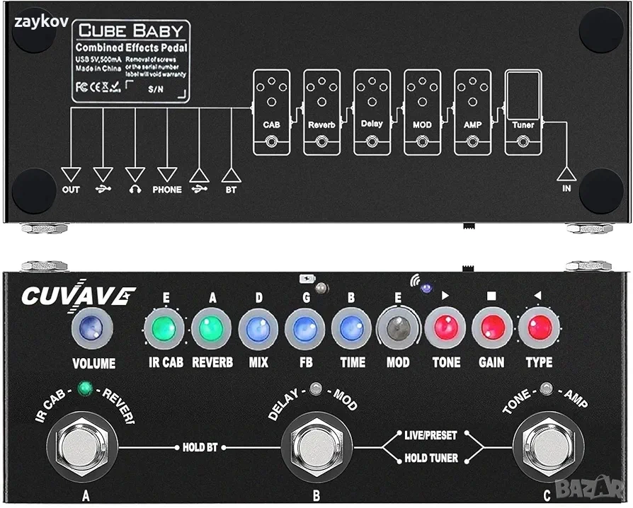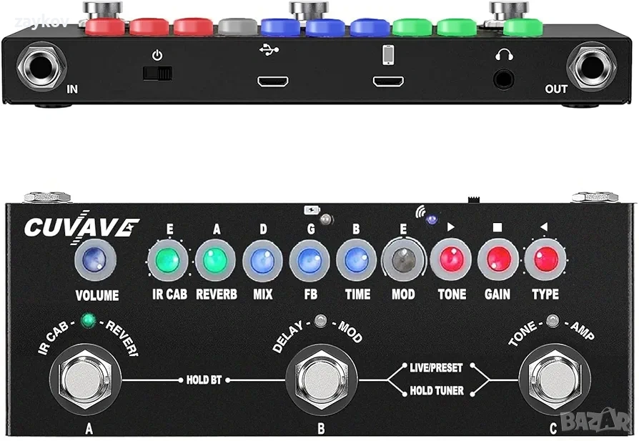 китара: Този мултиефектен педал за китара разполага с 9 IR класа и два модулационни ефекта (хорус, фазово изместване), забавяне на лентата и реверберация. Той включва също 8 IR симулации на кабинета и е съвместим с IR устройства на трети страни.