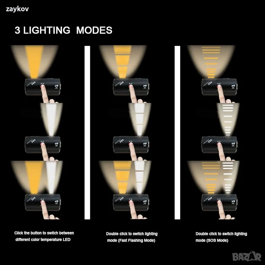 【9 режима на осветление】 Можете да изберете предпочитания от вас режим за шофиране: (1) постоянно светене, (2) 2 мигания, (3) 2 SOS, (4) къси светлини, (5) мигащи къси светлини, (6) SOS къси светлини, (7) дълги светлини, (8) мигащи дълги светлини, (9) SOS дълги светлини. Различните режими на осветление и мигане помагат на водачите да виждат и да бъдат виждани, като водачите могат да настроят всеки режим на осветление на произволна яркост.
