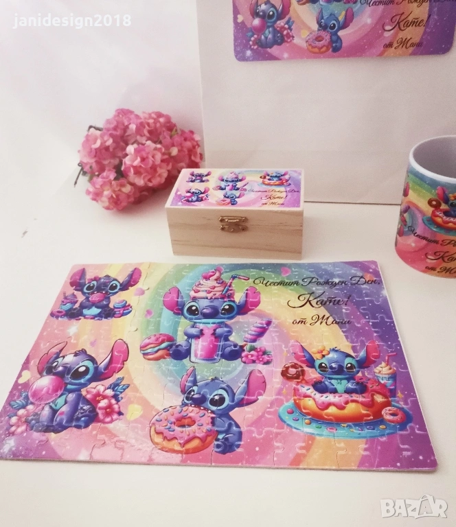 Подаръчен комплект Стич с име по поръчка пъзел, Чаша и персонална подаръчна торбичка