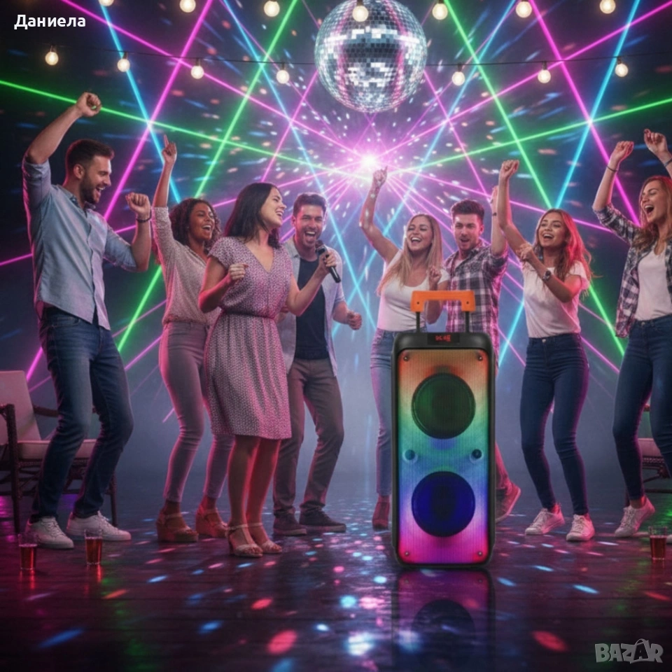 Материал / корпус: устойчива пластмаса и метални елементи; Размери / тегло: приблизително 29 × 29 × 62 см; Мощност / батерия: 40W, вградена литиево-йонна батерия 7.4V / 4500 mAh (включена в уреда, не са нужни допълнителни батерии); Свързване / съвместимост: Bluetooth (до 10 м), USB, SD карта, FM радио, дистанционно управление; Допълнителни функции: включен микрофон, TWS функция за свързване на две колони, LED светлинни ефекти, включен адаптер за зареждане.