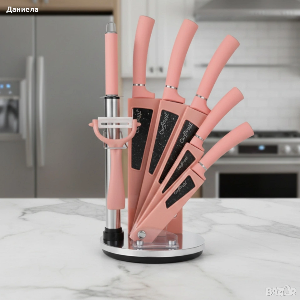 Материал: неръждаема стомана с незалепващо и антибактериално покритие, ергономични дръжки; Размери / вместимост: 17 см сатър, 20 см н о ж за готвач, 20 см н о ж за хляб, 13 см универсален н о ж 9,5 см н о ж за белене, точило, белачка и стойка с обща височина 36 см; Дебелина / здравина: устойчиви остриета, подходящи за ежедневно рязане; Поддръжка / почистване: подходящ за съдомиялна машина; Допълнителни функции: въртяща се основа, включено точило и белачка.