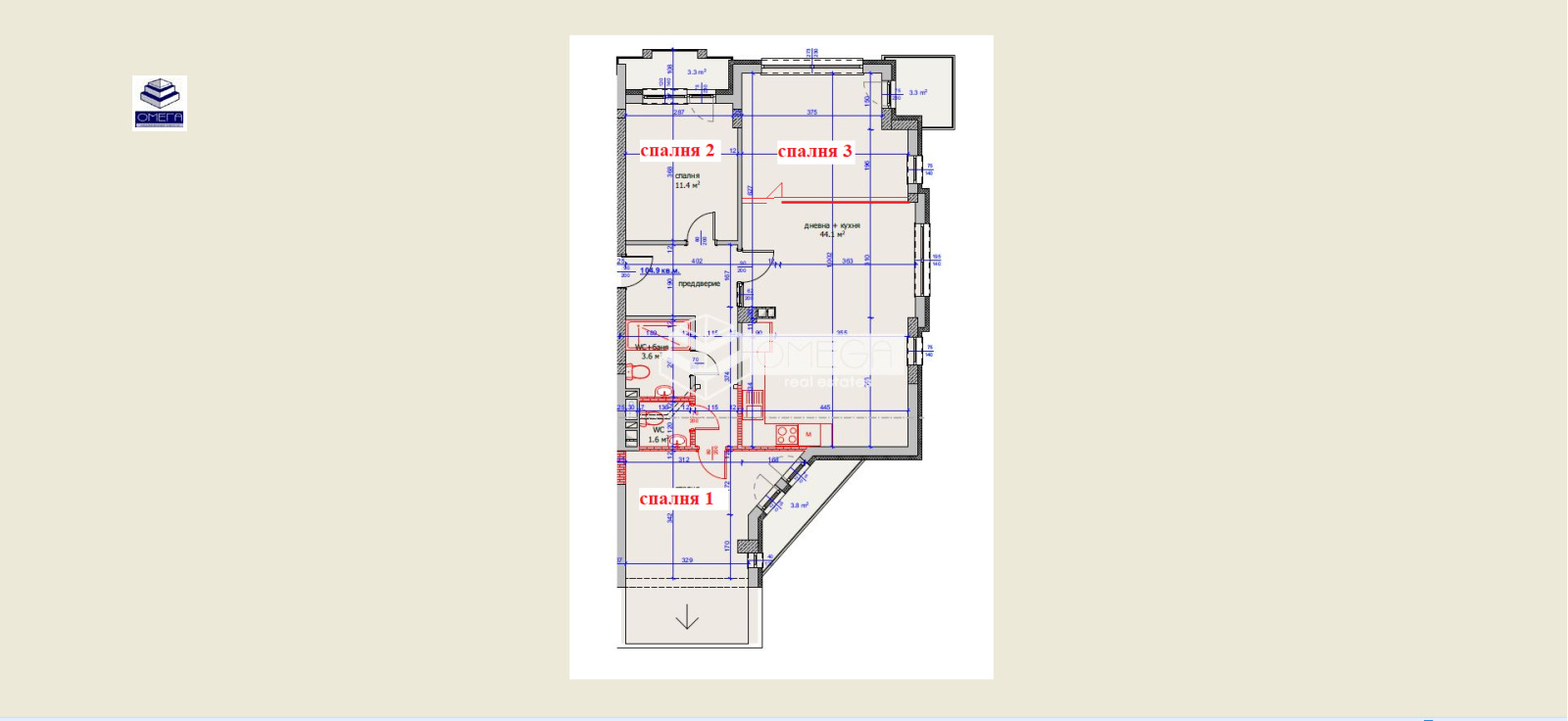 Апартаментът е с площ от 105 кв.м, намира се на пети жилищен етаж в сграда с асансьор, в ж.к. Лазур, гр. Бургас. Разпределението включва светла и функционална дневна с кухненска част, две спални, баня с тоалетна, втора тоалетна за удобство и тераси.