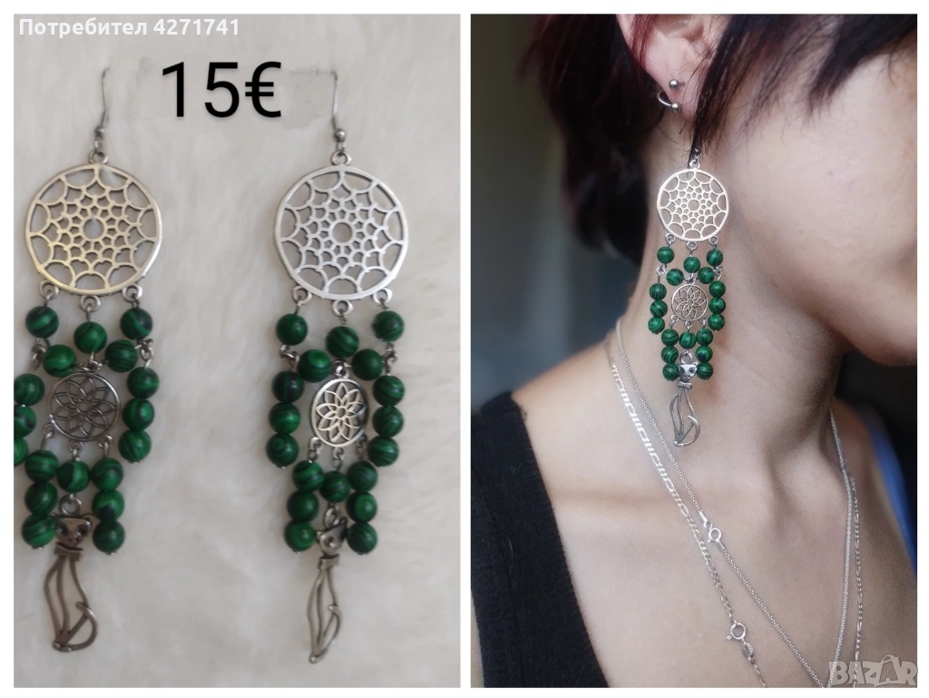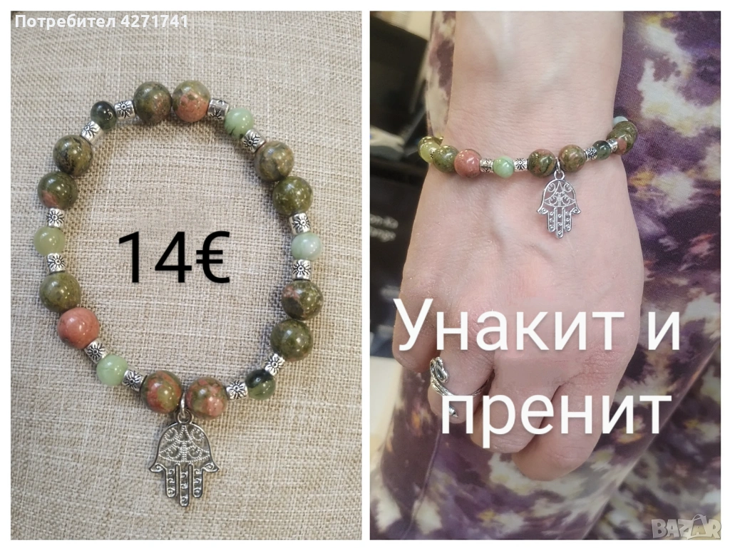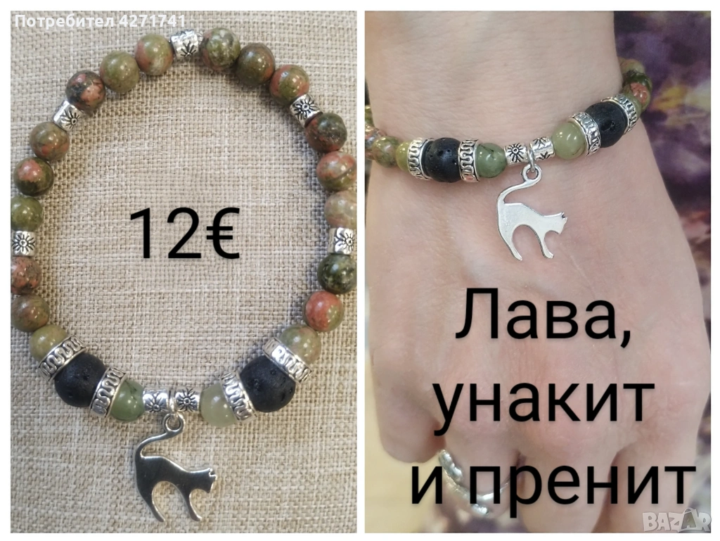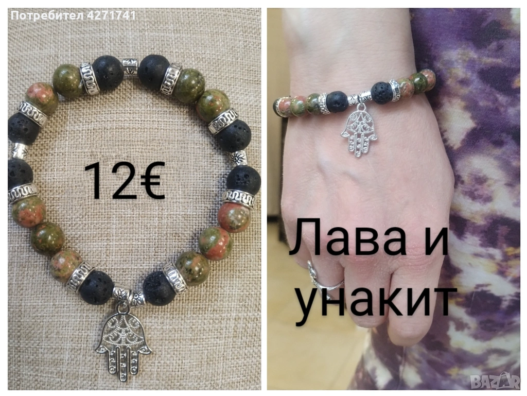 Материали, естествени камъни - унакит, малахит, содалит, розов кварц, лава, пренит. Дървени мъниста, метални висулки и детайли.