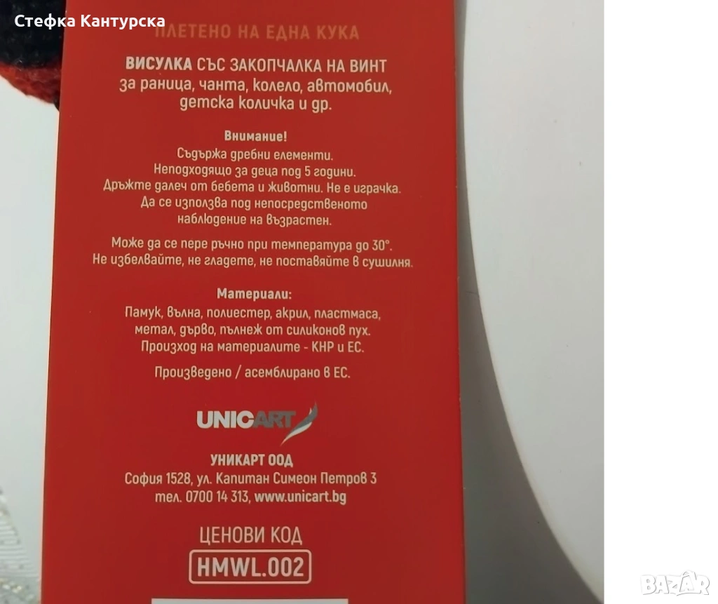 представлява плетена ръчно червена калинка.Изглежда като висулка със закопчалка