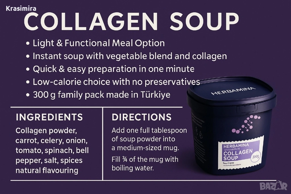 HERBAMINA Vegetable Mixed Collagen Soup е инстантна зеленчукова супа с добавен колаген, подходяща за бързо и лесно приготвяне. Комбинира приятен зеленчуков вкус с колаген, който подпомага ставите, кожата и общото състояние на организма.