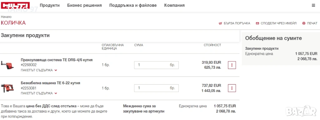 Магазинската цена на перфоратора с прахоуловителя е: 1 057.35евро БЕЗ ДДС (С ДДС е 1 268.82евро)