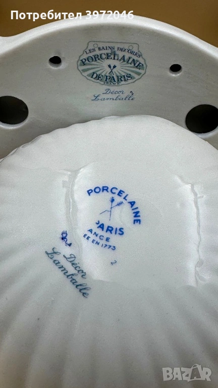 Маркировката “Porcelaine de Paris – France” с кръстосани стрели е типична за парижките ателиета, произвеждащи луксозен декоративен и санитарен порцелан, а не масова трапезна продукция.