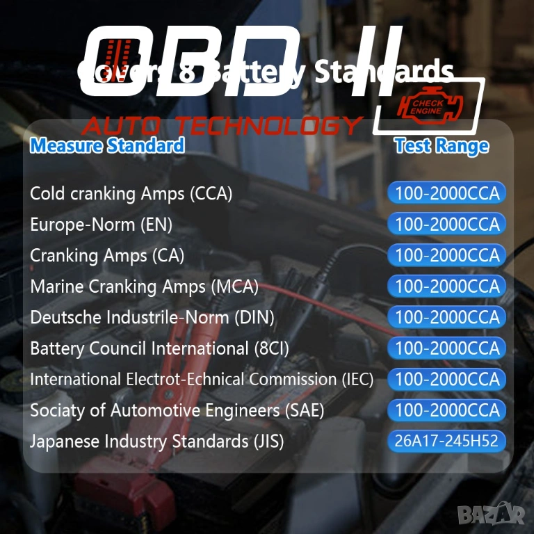 Стандарти за измерване: CCA, JIS, GB, SAE, MCA, CA, DIN, IEC, EN, BCI