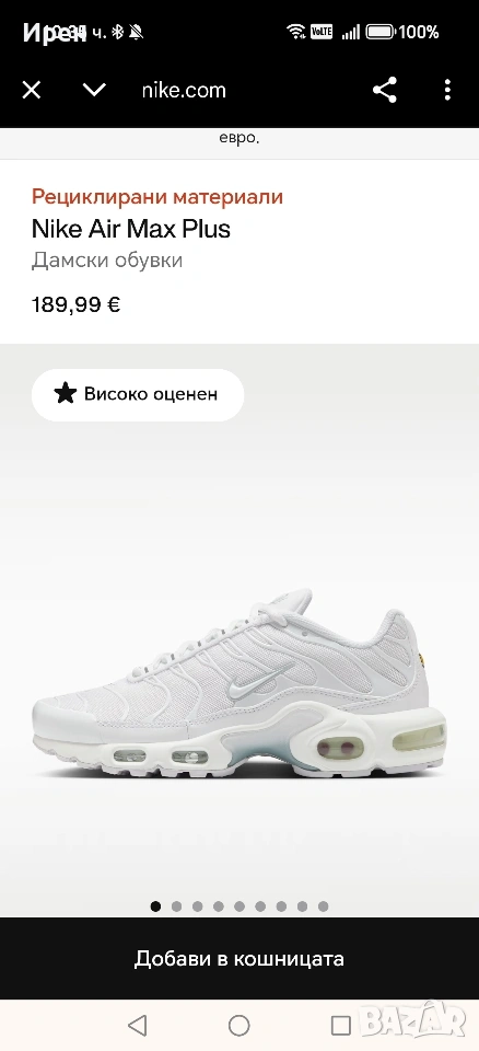 Продавам чисто нови Nike Air Max Plus, обувани веднъж и без кутия, защото я изхвърлих, размера им е 39, (24,5 см стелката),цената е съобразена с това че липсва кутията, прикачила съм последната снимка за да видите цената за която са купени. Изпращам по Еконт или Спиди с опция за преглед и тест, може и лично предаване за София. Разгледайте и другите ми обяви.