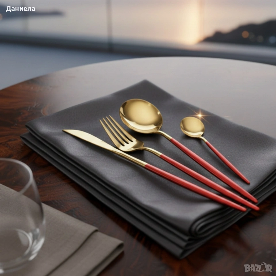 Материал: Неръждаема стомана; Брой части: 24 (за 6 души); Съдържание: 6 х ножове – 22 см х 1,5 см; 6 х вилици – 22,5 см х 2,7 см; 6 х супени лъжици – 22 см х 5 см; 6 х десертни лъжички – 13 см х 3 см; Цвят: златисто с червено; Поддръжка / почистване: Лесно измиване, устойчиви на честа употреба; Безопасност: Подходящи за контакт с храна; Опаковка: Магнитна кутия.
