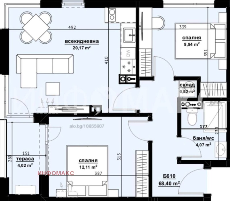 ✅ Дневна с кухненски кът: 20,17 кв.м.;