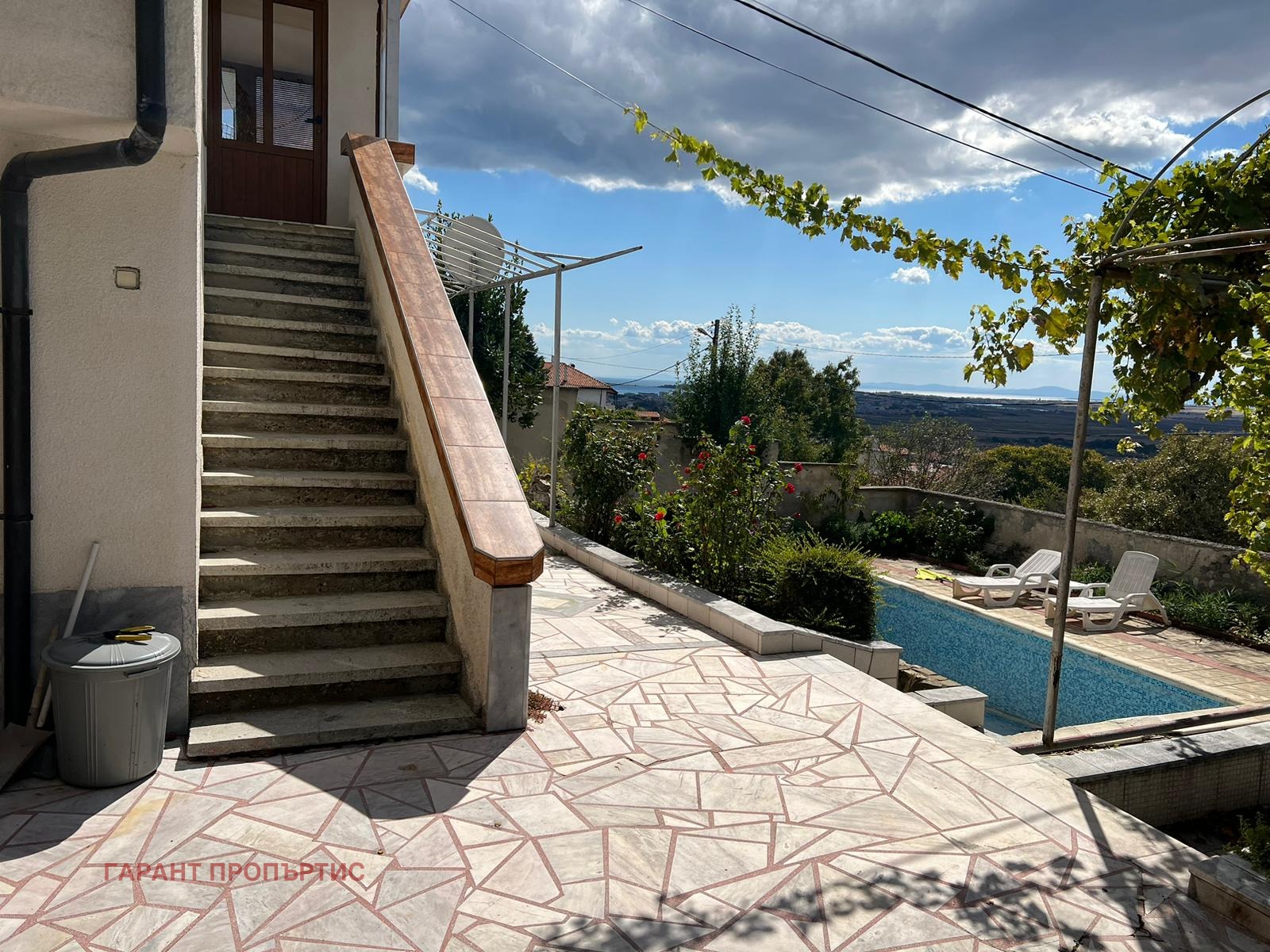 Издигната на най-високата точка в района, къщата разкрива панорамна гледка към морето и зеленината на Стара планина. Тя е проектирана с мисъл за простор и самостоятелност - включва три апартамента с по пет стаи, един тристаен апартамент, общо седем бани с тоалетни, както и множество допълнителни помещения. Комфортът е подсилен с два гаража (единият - двоен), двойно мазе и стопански сгради, подходящи за съхранение или хоби дейности.