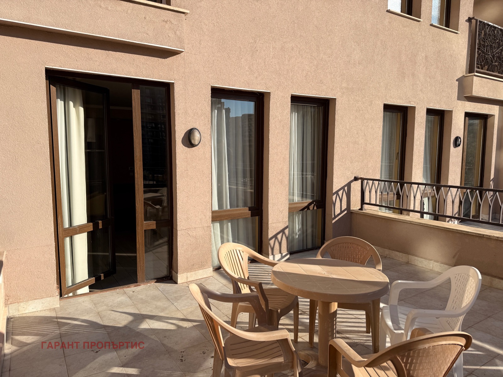 Разположен на първи жилищен етаж, апартаментът се радва на чудесна гледка към басейна и озеленените общи части на комплекса. С внушителна обща площ от 71.46 кв.м., жилището предлага простор, какъвто рядко се среща при студия, а голямата тераса допринася за усещането за свобода и връзка с външната среда. Интериорът е обзаведен в комфортен хотелски стил и се предлага във вида, показан на снимките готов за ползване или отдаване под наем.