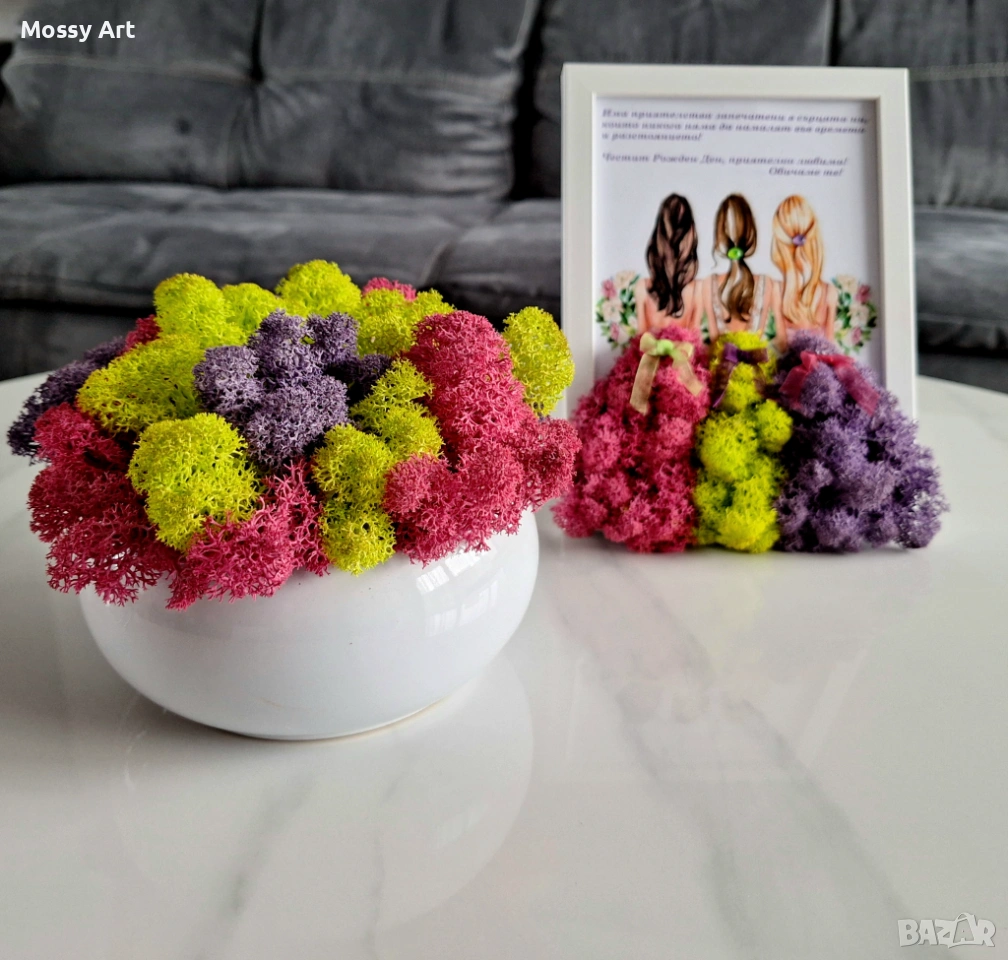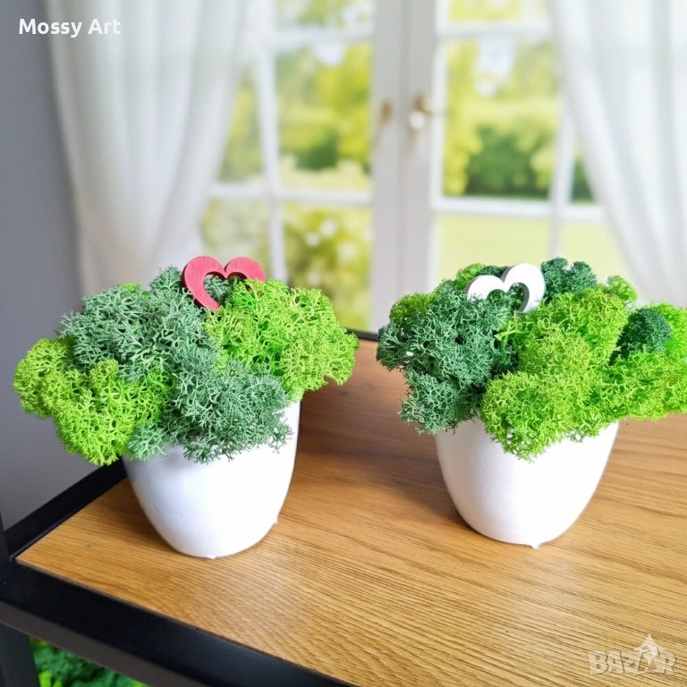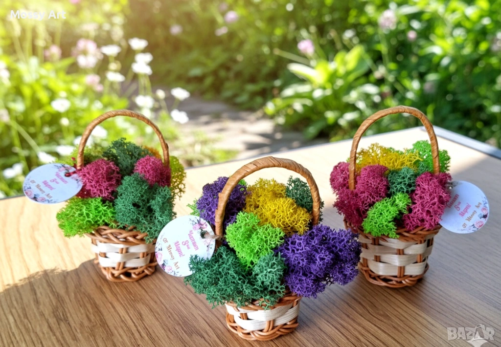 Чудесен подарък за 8ми март или за всеки един повод. Скандинавският мъх не изисква никакви грижи, не се пръска с вода. Той си поема от влагата във въздуха и това го поддържа в свеж вид. Започват от 5€