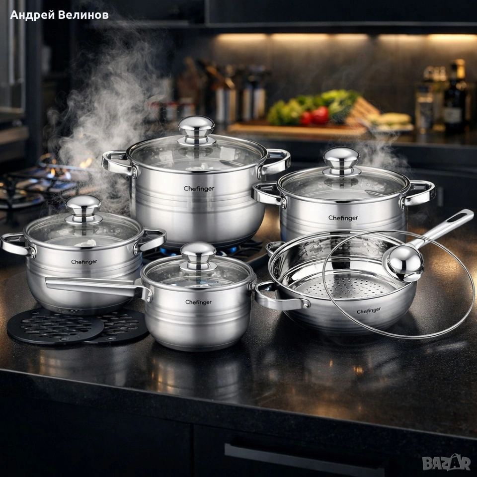 Комплект съдове за готвене 12 части Cheffinger, с индукционно дъно и стъклени капаци, снимка 1 - Съдове за готвене - 53199088 Комплект съдове за готвене 12 части Cheffinger, с индукционно дъно и стъклени капаци, снимка 2 - Съдове за готвене - 53199088 Комплект съдове за готвене 12 части Cheffinger, с индукционно дъно и стъклени капаци, снимка 3 - Съдове за готвене - 53199088 1/3