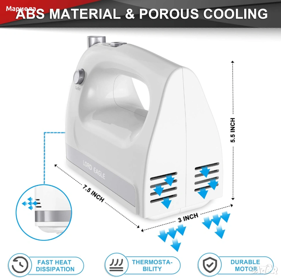 МОЩЕН 400W МОТОР И БЪРЗО РАЗСЕЙВАНЕ НА ТОПЛИНАТА – Разполага с най-новия, подобрен изцяло меден мотор, който се различава от стандартните алуминиеви мотори на пазара. Разбърквайте тесто, яйца, мляко, масло или дори сметана бързо, ефективно и лесно.