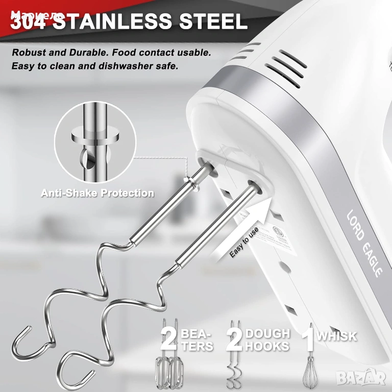 5 АКСЕСОАРА ОТ НЕРЪЖДАЕМА СТОМАНА И КУТИЯ ЗА СЪХРАНЕНИЕ С ЩРАКВАНЕ – Включва 2 × куки за тесто за разбиване на тесто, 2 × бъркалки и 1 × бъркалка за яйца и сметана. Тези аксесоари са изработени от висококачествена неръждаема стомана 304. Те са устойчиви на ръжда, издръжливи за ежедневна употреба и подходящи за съдомиялна машина за лесно почистване. Кажете сбогом на разхвърляните чекмеджета и изгубените бъркалки.