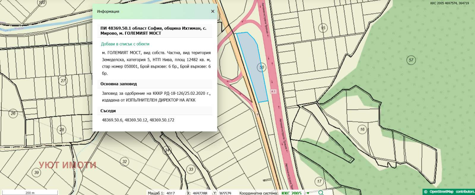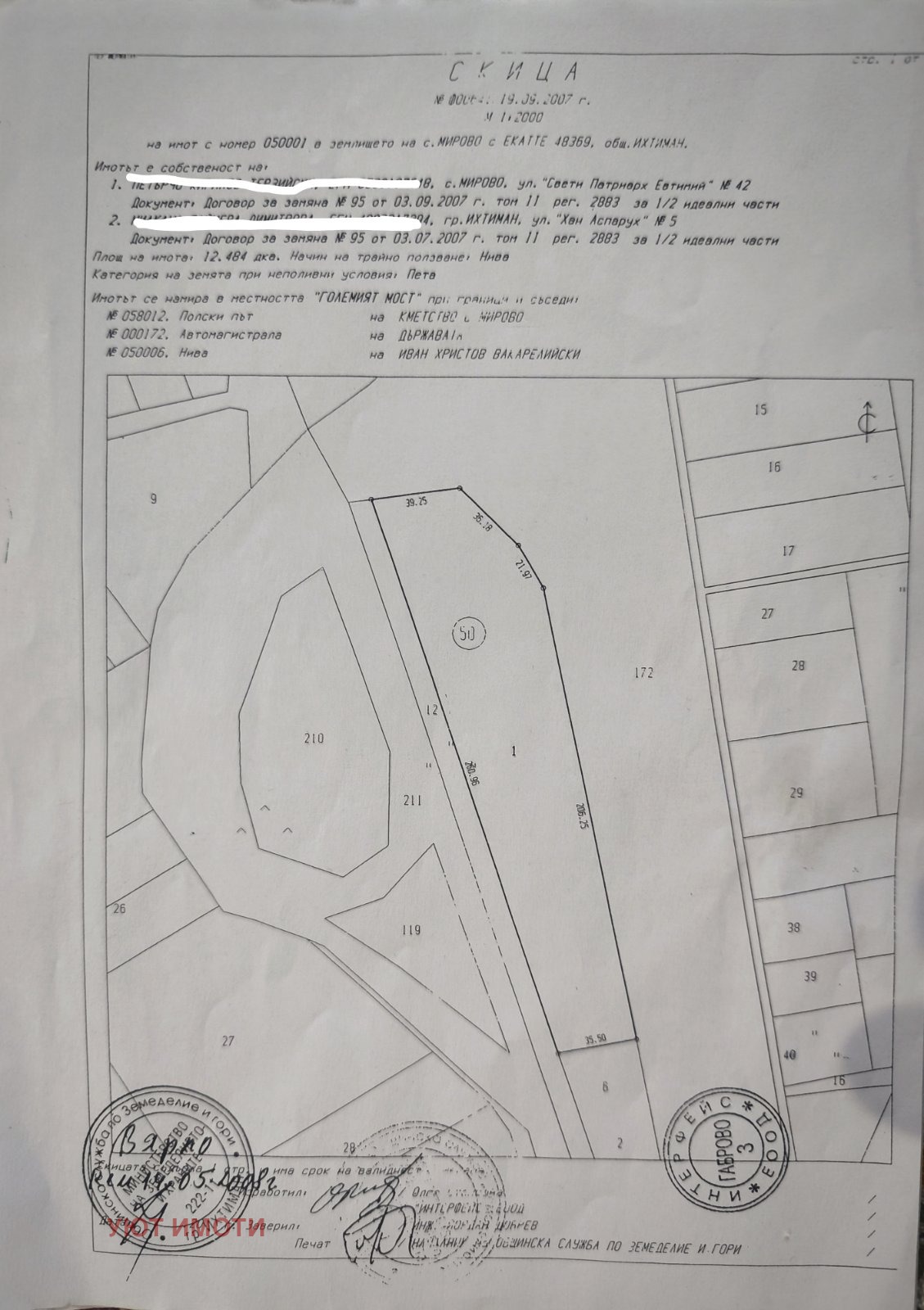 Продаваме поземлен имот (ПИ) с площ 12 482 кв.м, находящ се в с. Мирово, община Ихтиман, м. Големият мост , с директна видимост и достъп от автомагистрала Тракия (А1), в непосредствена близост до пътен възел.