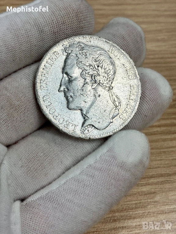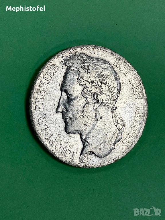 Стара и голяма сребърна монета от първата половина на XIX век - 25 грама каталожно тегло, диаметър 37 мм, сребро проба 0.900, надписан гурт - 'DIEU PROTÈGE LA BELGIQUE *'. Първи портрет на Леополд I, с венец, нисък тираж - 699 600 бр.
