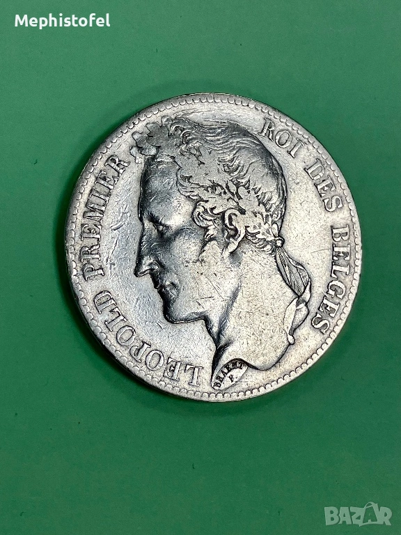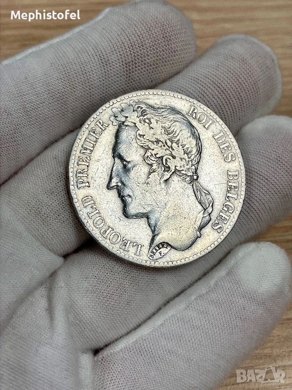 Стара и голяма сребърна монета от първата половина на XIX век - 25 грама каталожно тегло, диаметър 37 мм, сребро проба 0.900, надписан гурт - 'DIEU PROTÈGE LA BELGIQUE *'. Първи портрет на Леополд I, с венец, по-рядко срещан дизайн спрямо следващия.